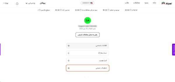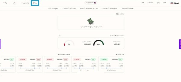 پس از ورود به بروکر آلپاری با وارد کردن ایمیل و رمز عبور، میتوانید وارد پنل شخصی شوید. سپس از نوار بالای صفحه روی گزینه پروفایل کلیک کنید.