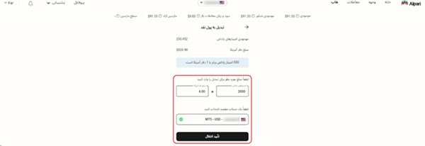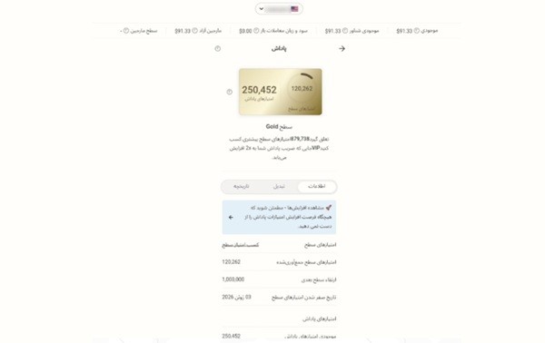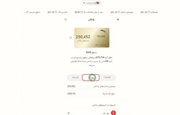 همچنین، امکان تبدیل مستقیم امتیازات به اعتبار معاملاتی وجود دارد. کافی است در هر زمان امتیازات خود را وارد کنید، حساب مقصد را انتخاب کرده و گزینه انتقال را بزنید.