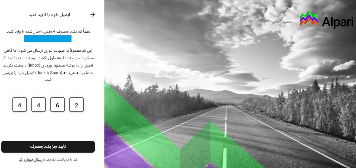 یک کد ۴ رقمی به ایمیل شما ارسال میشود که باید آن را در فیلد مربوطه وارد کنید.