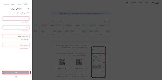 سپس اطلاعات محل سکونت شامل شهر، آدرس و کد پستی را وارد کنید.