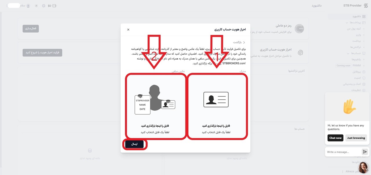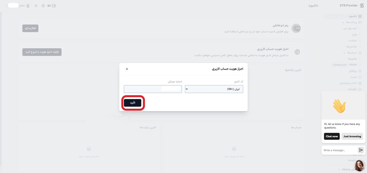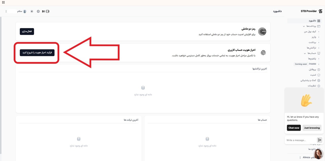 پس از ورود به بروکر STB، وارد پنل کاربری خود شوید و روی گزینه «فرآیند احراز هویت را شروع کنید» کلیک کنید.