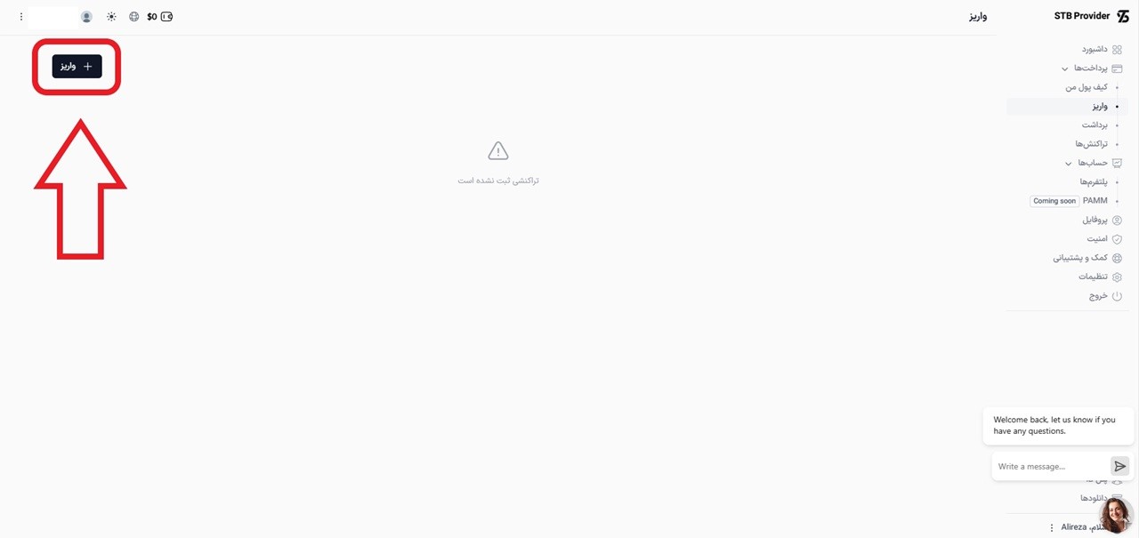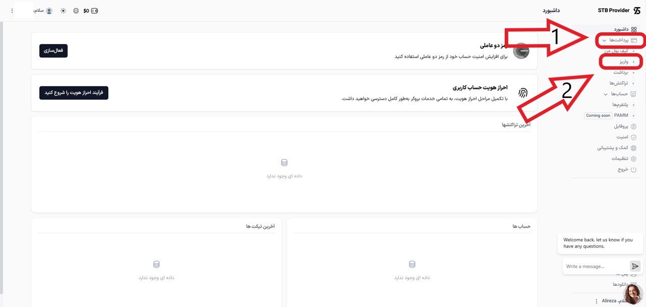 پس از ورود به بروکر STB، از منوی سمت چپ پنل کاربری گزینه «پرداختها» را انتخاب کرده و روی «واریز» کلیک کنید.