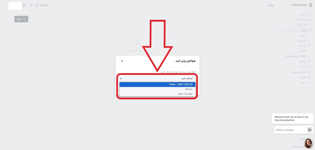 برای واریز وجه در بروکر اس تی بی کاربران میتوانند از روشهای مختلفی مانند انتقال بانکی، بیتکوین و تتر استفاده کنند که بهترین و سریعترین گزینه، واریز از طریق تتر است. این روند ساده و امن طراحی شده تا معاملهگران بدون دغدغه بتوانند حساب معاملاتی خود را شارژ کنند. در ادامه مراحل کامل آموزش بروکر STB برای واریز وجه توضیح داده شده است: