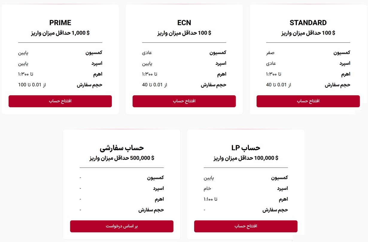 این بروکر 5 نوع حساب معاملاتی شامل Standard، ECN، Prime، LP و Custom ارائه میدهد که هر کدام شرایط اسپرد و کمیسیون متفاوتی دارند.