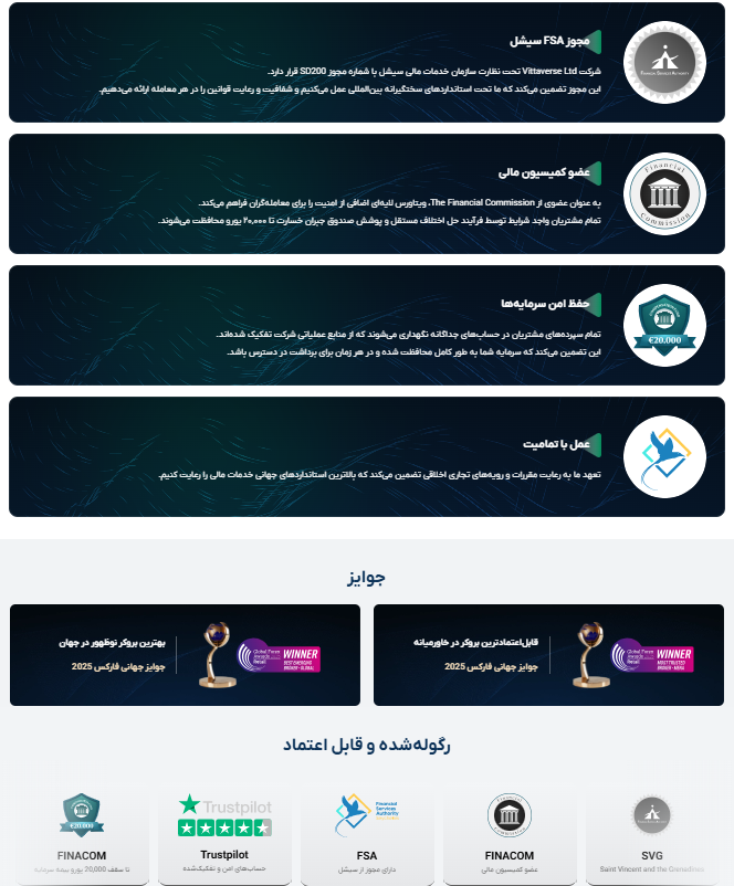 طبق آنچه در وبسایت رسمی این کارگزار درج شده، بروکر ویتاورس موفق به دریافت دو عنوان مهم از جوایز جهانی فارکس 2025 شده است. این جوایز شامل «قابلاعتمادترین بروکر در خاورمیانه» و «بهترین بروکر نوظهور در جهان» میشود که نشاندهنده رشد سریع و جایگاه ویژه این کارگزار در بازارهای بینالمللی است. چنین افتخاراتی در کنار خدمات معاملاتی متنوع و نوآوریهای ارائهشده، بر اعتبار بروکر ویتاورس میافزاید و آن را در میان بروکرهای تازهتأسیس، متمایز میسازد. البته لازم است در بررسی بروکر ویتاورس علاوه بر توجه به جوایز، سایر فاکتورهای مهم مانند رگولاتوری و شرایط حسابها نیز در نظر گرفته شود تا تصمیمگیری جامعتری انجام گیرد.