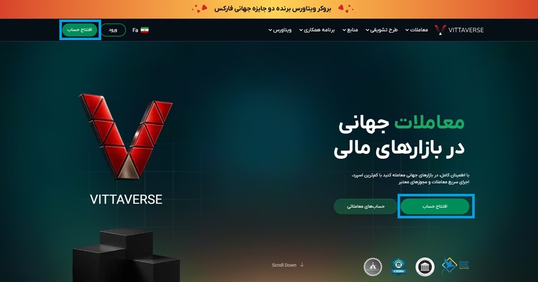 ابتدا وارد وبسایت رسمی بروکر به نشانی vittaverse.com شوید و روی گزینه ایجاد حساب کلیک کنید.