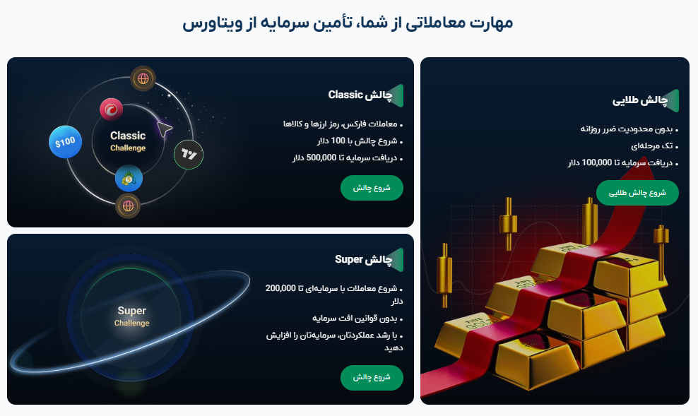 ویتاورس چندین چالش پراپ تریدینگ (مثل Gold, Super, Classic, Fast, Master) دارد که از بخش Prop Trading حساب کاربری میتوان وارد شد.