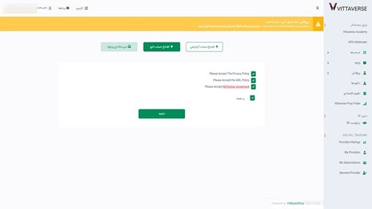 پیش از ورود نهایی، باید تیک قراردادهای ارائهشده را فعال کنید و سپس به داشبورد کاربری دسترسی پیدا خواهید کرد.