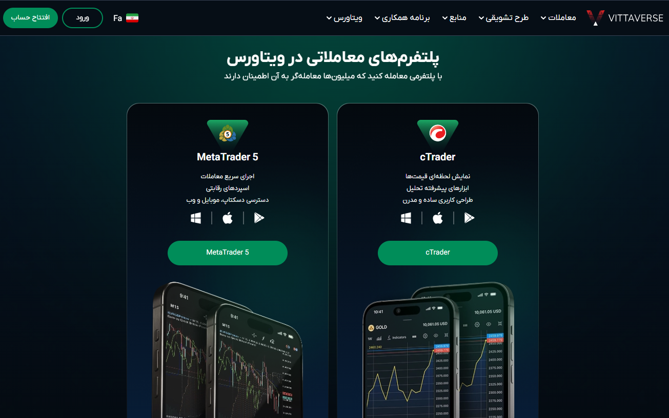بروکر ویتاورس برای ارائه خدمات معاملاتی به کاربران خود از دو پلتفرم محبوب متاتریدر 5 و Ctrader استفاده میکند. متاتریدر 5 این بروکر بهصورت فول لایسنس در دسترس بوده و با استفاده از سرورهای قدرتمند در انگلستان، امارات متحده عربی و هلند، سرعت و پایداری بالایی را برای اجرای معاملات فراهم میآورد. همچنین، پلتفرم سی تریدر بهعنوان گزینهای پیشرفتهتر برای معاملهگرانی که به ابزارهای تحلیلی حرفهای و اجرای سریع سفارشات نیاز دارند، در اختیار کاربران قرار گرفته است. برای آغاز معامله کافی است فرآیند ورود به ویتاورس را انجام دهید تا به این پلتفرمهای قدرتمند دسترسی داشته باشید.