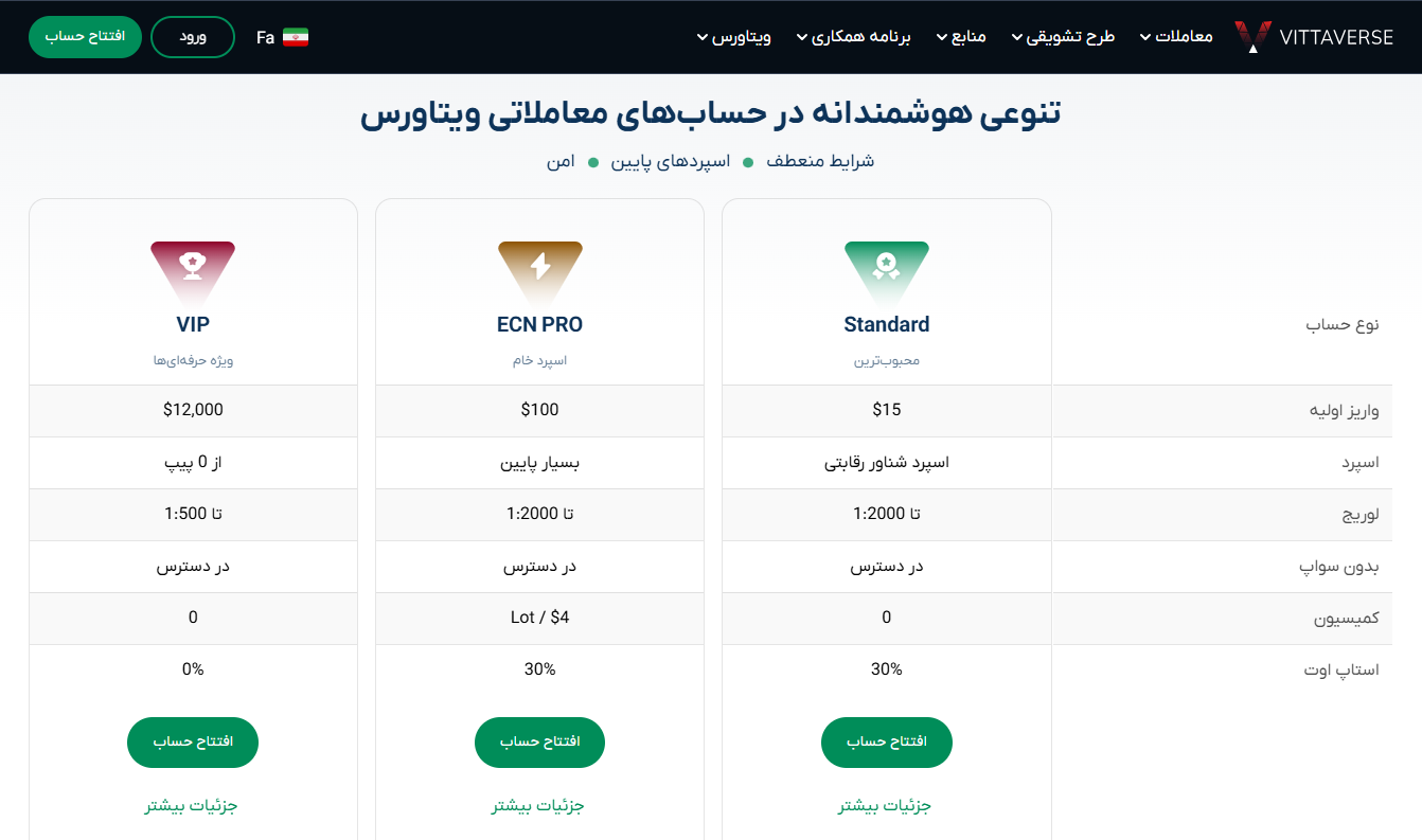 بروکر ویتاورس سه نوع حساب معاملاتی متنوع را برای پاسخگویی به نیازهای مختلف معاملهگران ارائه میدهد. هرکدام از این حسابها ویژگیهای خاصی دارند و متناسب با سطح سرمایه و سبک معاملاتی کاربران طراحی شدهاند. برای افتتاح هرکدام از این حسابها تنها کافی است به پنل کاربری خود وارد شوید و مراحل ثبتنام را تکمیل کنید.