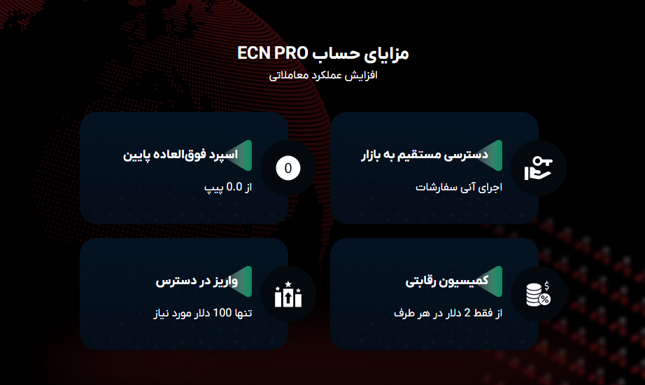 برای کسانی که به دنبال اسپرد بسیار پایین و اجرای سریع هستند، حساب ECN Pro با حداقل سرمایه ۱۰۰ دلار طراحی شده است. اسپردها در این حساب نزدیک به صفر بوده و کمیسیون ۴ دلار بهازای هر لات دریافت میشود. اهرم معاملاتی تا 1:2000 و استاپ اوت ۳۰٪ از دیگر مشخصات آن است.