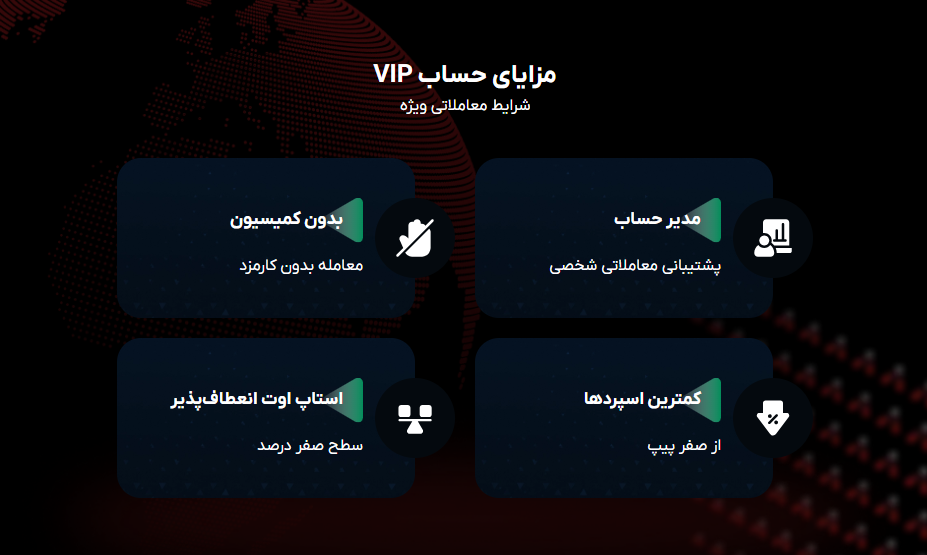 این حساب ویژه معاملهگران حرفهای با حداقل واریز ۱۲,۰۰۰ دلار ارائه میشود. اسپردها از ۰ پیپ آغاز میشوند و هیچ کمیسیونی برای معاملات دریافت نمیشود. همچنین، با اهرم معاملاتی تا 1:500 و استاپ اوت صفر درصد، انعطاف بیشتری برای استراتژیهای بزرگ و حرفهای در اختیار کاربران قرار میدهد.