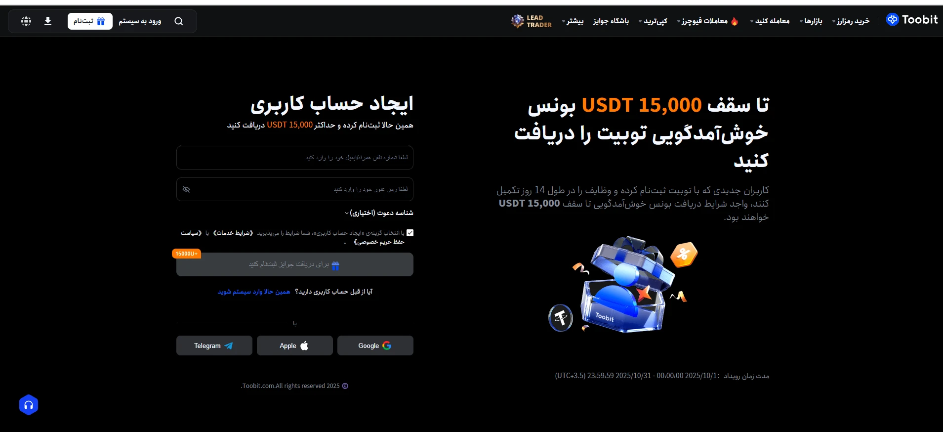 برای دسترسی به سایت رسمی صرافی توبیت، باید از نشانی toobit.com استفاده کنید. برخی دامنههای فارسی که با نام و لوگوی توبیت فعالیت میکنند، تنها لینکهای ارجاعی (رفرال) هستند و هیچ ارتباط رسمی با صرافی اصلی ندارند. تشابه ظاهری این سایتها میتواند کاربران را به اشتباه بیندازد و زمینه سوءاستفاده را فراهم کند. با ورود و ثبتنام از طریق لینک اختصاصی ما، میتوانید از تخفیف ویژه در کارمزد معاملات بهرهمند شوید و تجربهای امن و مطمئن در استفاده از پلتفرم توبیت داشته باشید.