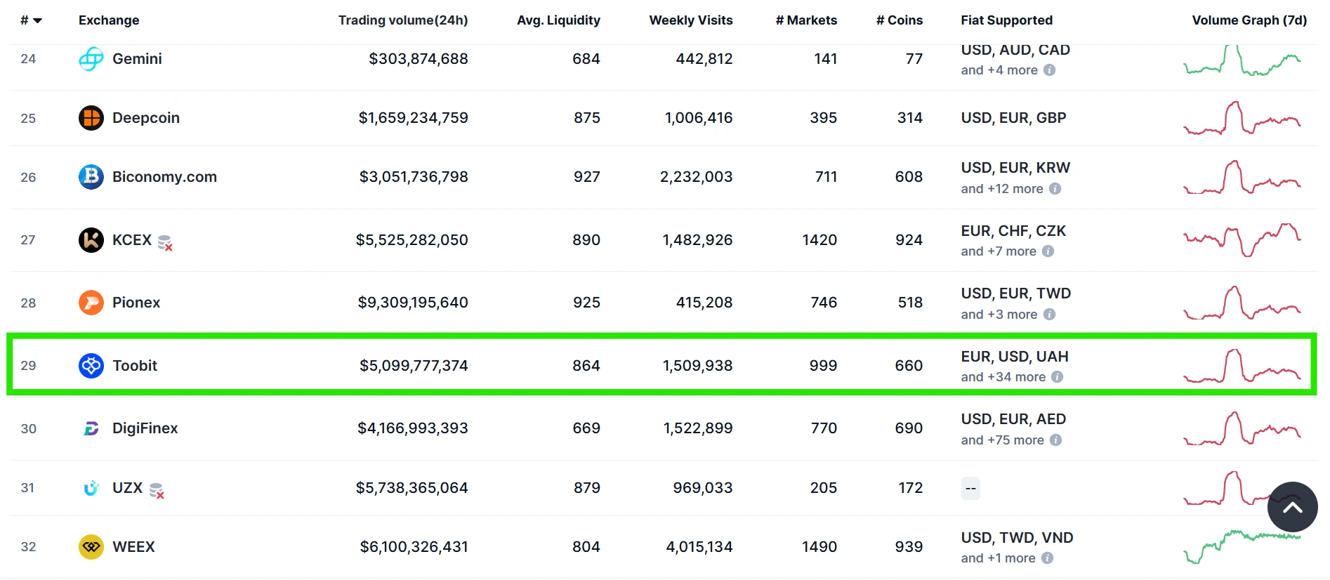 از سوی دیگر، در رتبهبندی وبسایت معتبر CoinGecko، صرافی Toobit جایگاه بسیار بهتری دارد. طبق آخرین دادههای منتشرشده، توبیت در بخش بازار اسپات رتبهی ۲۳ را میان صرافیهای متمرکز کسب کرده است، در حالی که در بازار فیوچرز، این صرافی موفق شده به رتبهی ۴ جهانی دست یابد. این آمار نشان میدهد که توبیت بهسرعت در حال رشد بوده و توانسته اعتماد بخش بزرگی از جامعهی تریدرها را به خود جلب کند.