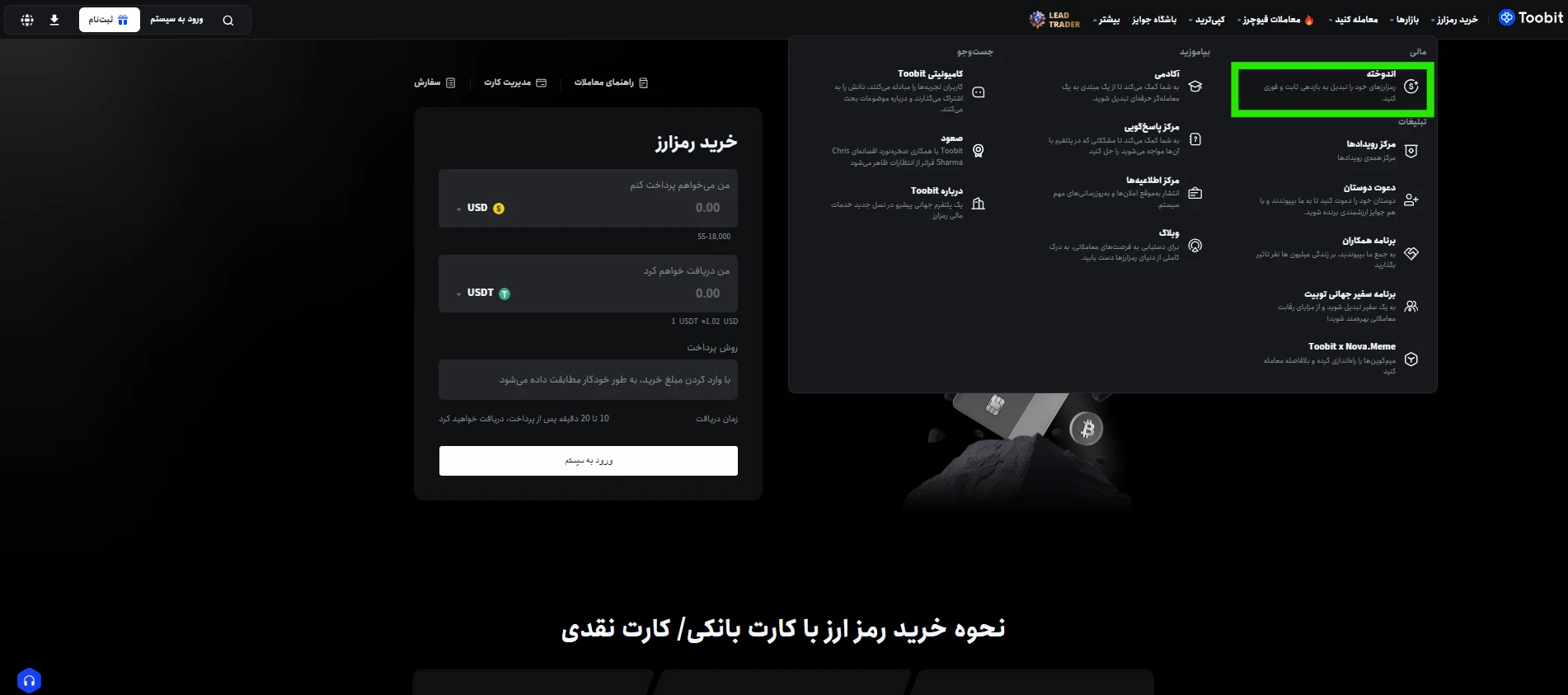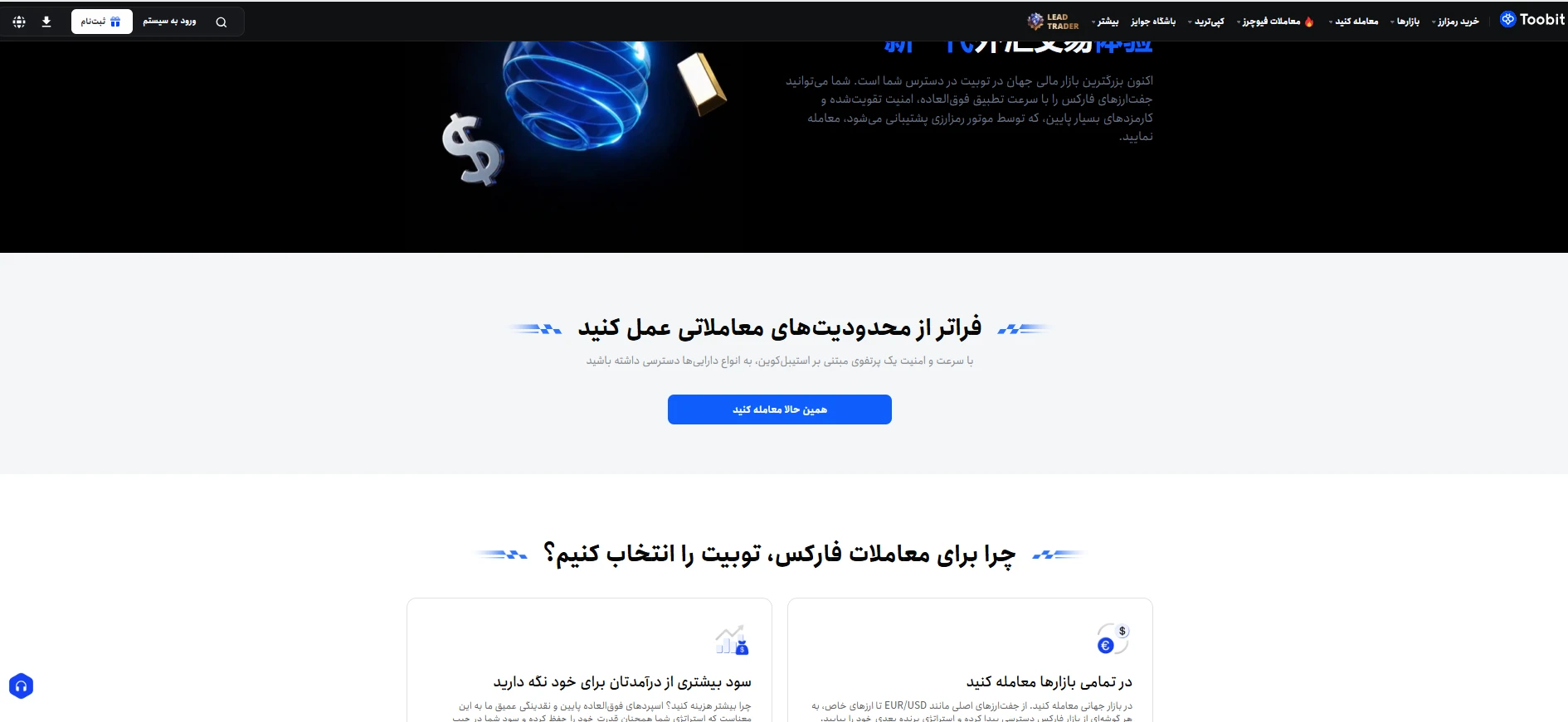صرافی توبیت (Toobit) یکی از معتبرترین پلتفرمهای معاملاتی ارز دیجیتال است که بیش از ۲ میلیون معاملهگر فعال در جامعه خود دارد. این صرافی برای کاربران ایرانی امکان ثبتنام سریع و بدون نیاز به احراز هویت را فراهم کرده است تا بتوانند به راحتی معاملات خود را آغاز کنند. در توبیت میتوانید بیش از ۱۰۰۰ ارز دیجیتال را در بازارهای اسپات و فیوچرز خرید و فروش کنید و از امکانات متنوع این پلتفرم برای مدیریت داراییها و اجرای استراتژیهای معاملاتی بهرهمند شوید.