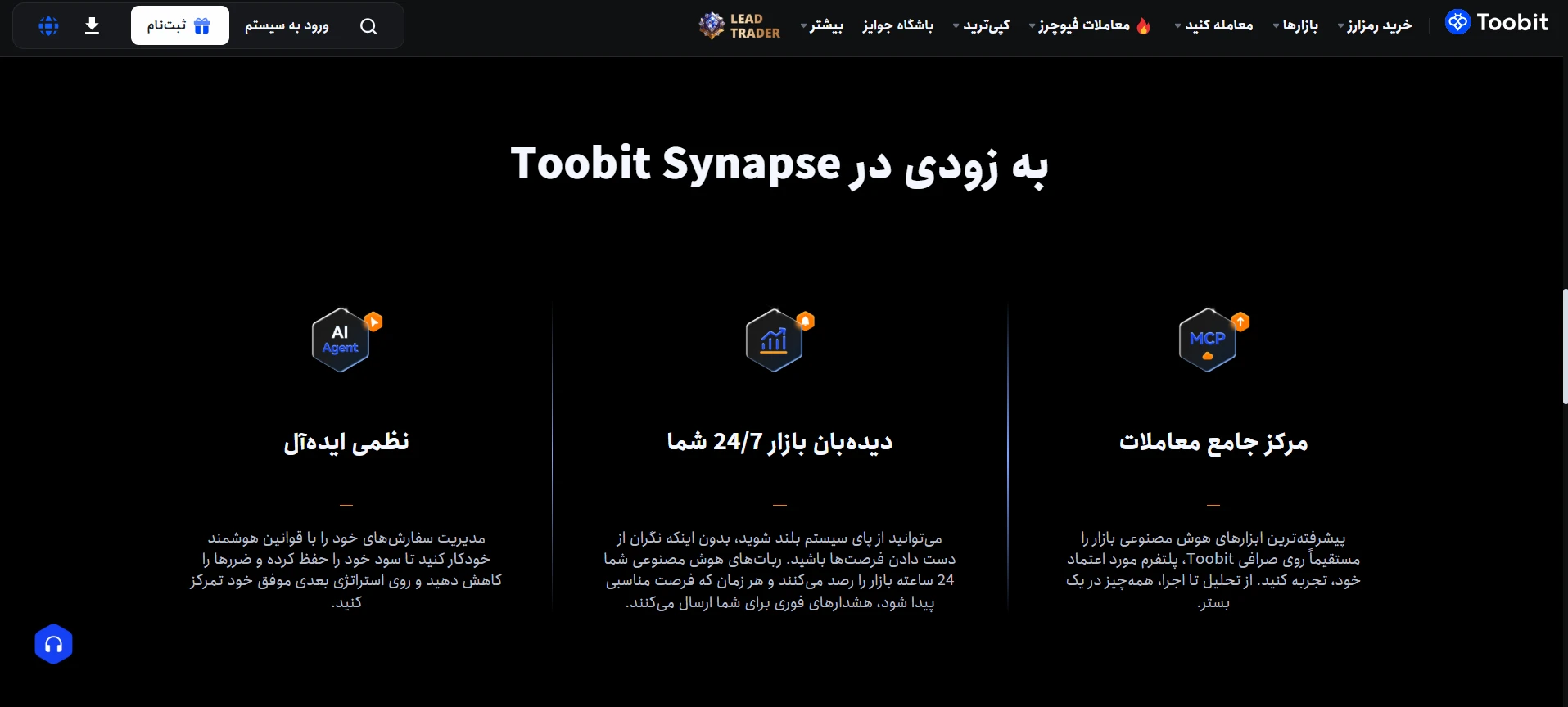 Speed Zone یکی از قابلیتهای نوآورانه و انحصاری صرافی Toobit است که مشابه مفهومی مانند IEO یا سکوی پرتاب (Launchpad) در سایر صرافیها عمل میکند، اما با تفاوتهای چشمگیر. در این بخش، کاربران میتوانند توکنهایی را قبل از عرضه رسمی آنها در بازار اسپات توبیت خریداری کنند. این یعنی کاربران از دسترسی زودهنگام و قیمت معرفی ویژه بهرهمند میشوند. در واقع، هدف اسپید زون این است که کاربران توبیت بتوانند در مراحل پیشفروش توکنها شرکت کرده و در صورت رشد قیمت پس از لیست شدن، از سود بالقوه بهرهمند شوند. این قابلیت به دلیل محدود بودن زمان و تعداد عرضهها، جذابیت بالایی دارد و فرصتی مناسب برای کاربران علاقهمند به پروژههای نوظهور و سرمایهگذاری زودهنگام فراهم میکند. به بیان ساده، Speed Zone پلی است میان پیشفروش توکنها و بازار اسپات رسمی، که تجربهای سریع، خاص و سودآور برای کاربران ایجاد میکند.Toobit Synapse (دستیار هوش مصنوعی توبیت)