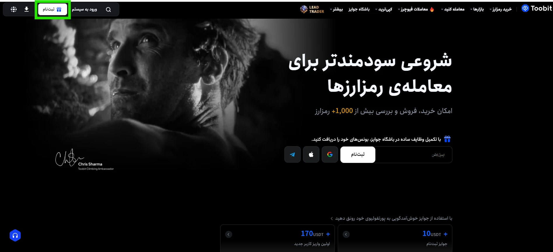 ثبتنام در صرافی توبیت (Toobit) بسیار ساده است و تنها چند دقیقه زمان میبرد. این صرافی از ثبتنام بدون احراز هویت نیز پشتیبانی میکند، بنابراین کاربران ایرانی میتوانند بهراحتی حساب کاربری خود را ایجاد و شروع به معامله کنند. پیشنهاد میشود برای افزایش امنیت، از ایمیل معتبر و رمز عبور قوی استفاده کنید. 1. ابتدا روی دکمه «ثبتنام» در نوار بالای سایت صرافی توبیت کلیک کنید.